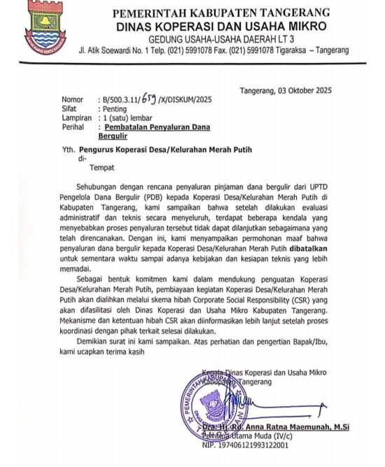 KABUPATEN TANGERANG – Pemerintah Daerah Kabupaten Tangerang melalui Dinas Koperasi dan Usaha Mikro membatalkan penyaluran dana bergulir dari UPTD Pengelola Dana Bergulir (PDB) kepada Koperasi Desa/Kelurahan Merah Putih di Kabupaten Tangerang.