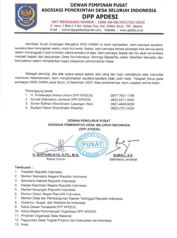 “MENGGUGAH HATI BAPAK PRESIDEN akan menjadi jembatan Desa-Desa se Indonesia agar bisa terus membersamai Bapak Presiden dalam pembangunan Desa untuk masa yang akan datang,” ungkap ketua DPP APDESI Surtawijaya dalam surat ajakan aksi, dikutip (02/12/2025).
