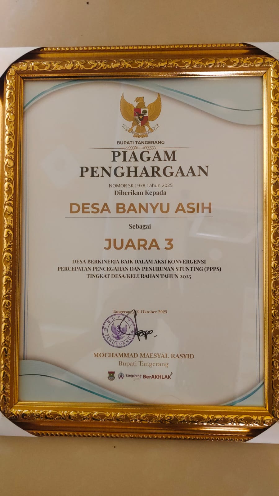 KABUPATEN TANGERANG – Meskipun Pemerintah Desa Banyu Asin Kecamatan Mauk, hanya meraih penghargaan Juara 3 dalam rangka Lomba Desa berkinerja baik dalam aksi Konvergensi Percepatan, Pencegahan,dan Penurunan Stunting (PPPS) tingkat Desa/Kelurahan se-Kabupaten Tangerang Tahun 2025, tapi membuktikan jika Desa tersebut masuk dalam katagori Inovatif.
