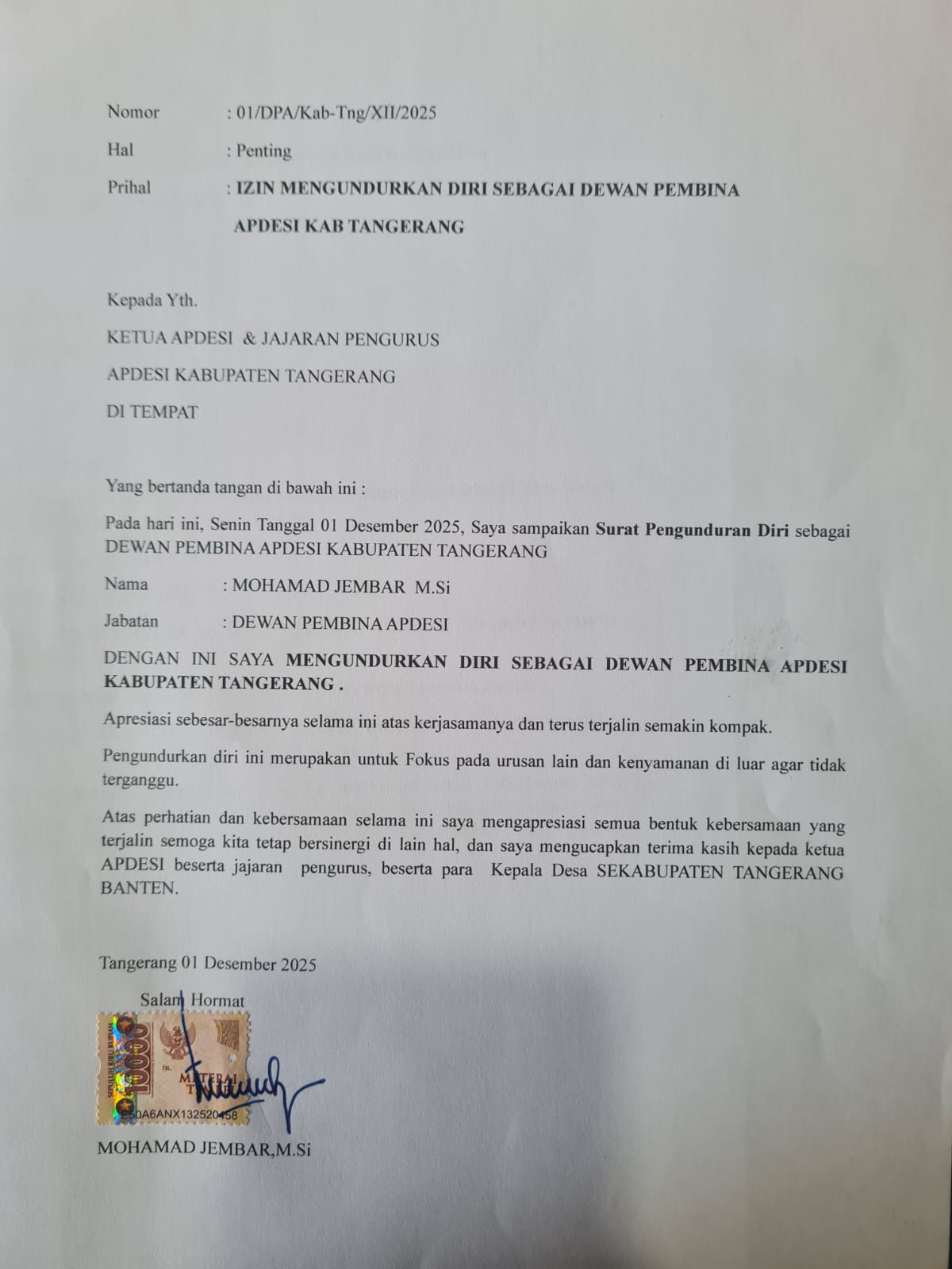 KABUPATEN TANGERANG – Akhirnya Dewan Pembina Asosiasi Pemerintah Desa Seluruh Indonesia (APDESI) Kabupaten Tangerang, M. Jembar M.Si, secara resmi mengajukan surat pengunduran diri dari jabatannya.