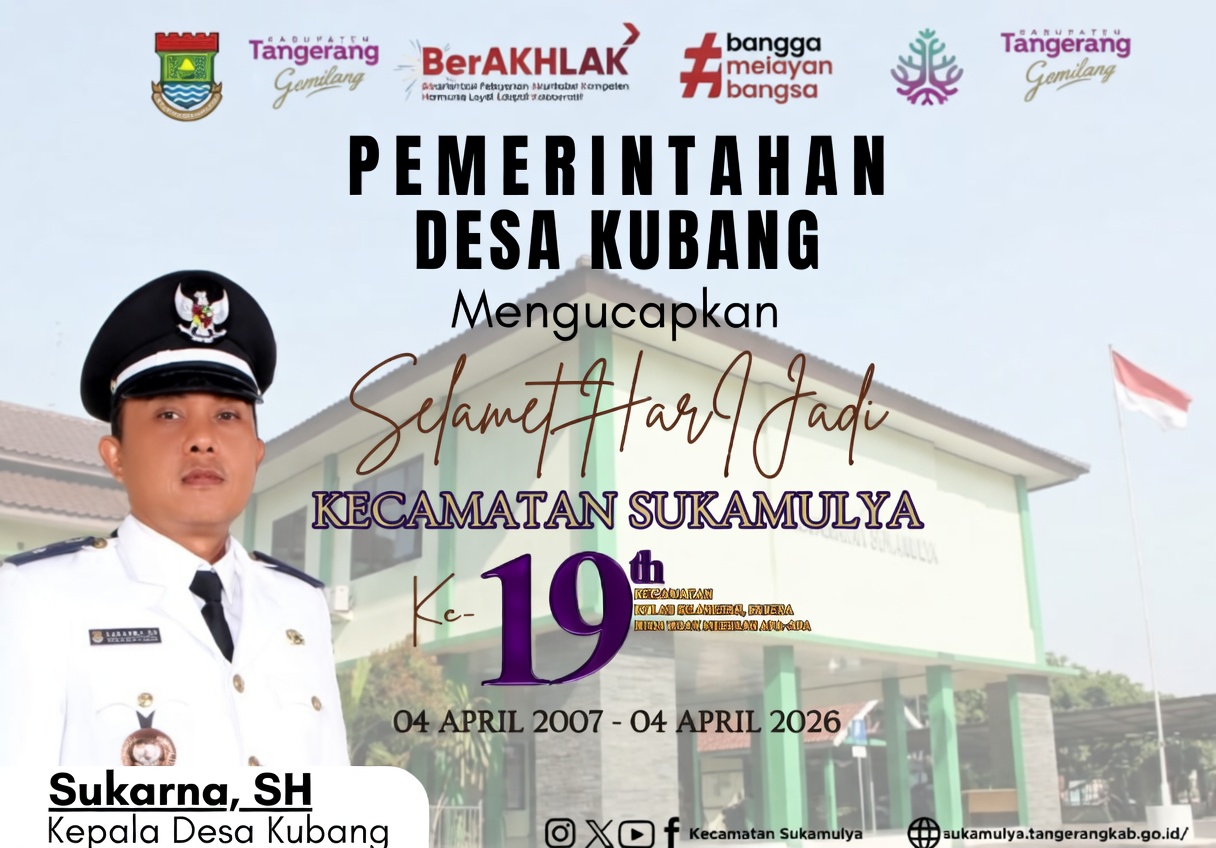 Sebagai informasi, Kecamatan Sukamulya resmi berdiri pada 4 April 2007 setelah dimekarkan dari Kecamatan Balaraja. Pada tahun 2026 ini, kecamatan tersebut genap berusia 19 tahun dengan mengusung tema “Kolaborasi Bersama Membangun untuk Kemajuan Masyarakat.”