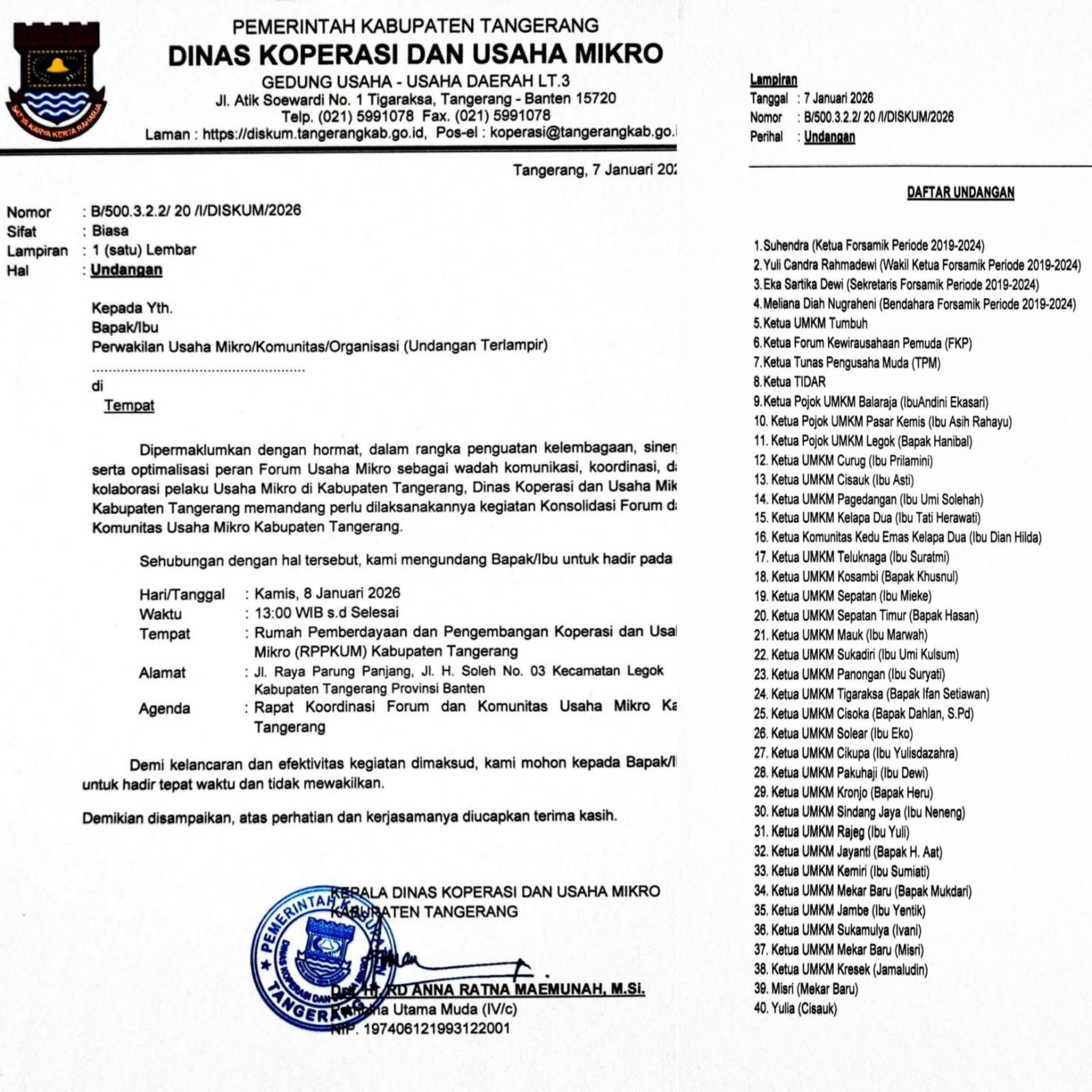 Tim Formatur pembentukan kepengurusan Forsamik kemudian melakukan koordinasi dengan Sekretaris Pribadi Bupati Tangerang. Dari hasil koordinasi tersebut, diarahkan agar Dinas Koperasi dan Usaha Mikro Kabupaten Tangerang menerbitkan nota dinas sebagai bagian dari tahapan administrasi.